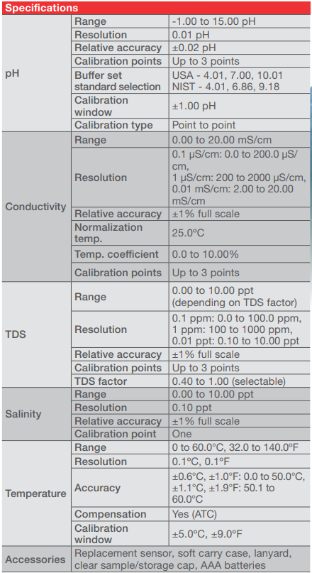 – สามารถวัดค่า pH, EC, TDS, ความเค็ม และอุณหภูมิในเครื่องเดียวกัน
