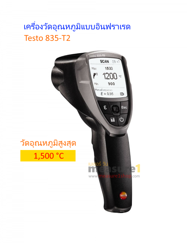 Testo 835-T2 เครื่องวัดอุณหภูมิแบบอินฟราเรด เป็นเครื่องวัดอุณหภูมิแบบวัดโดยไม่ต้องสัมผัส เพียงยิงไปที่จุดหมายที่ต้องการวัด ก็สามารถอ่านค่าได้ ลักษณะของเครื่องจะออกแบบมาคล้ายปืน ทำให้จับได้กระชับมือ อีกทั้งมีเลเซอร์ชี้เป้า แบบ 4 จุด ทำให้ทราบตำแหน่งการวัดค่าได้อย่างแม่นยำ และรวดเร็ว, วัดอุณหภูมิได้สูงถึง 1,500 °C เหมาะสำหรับวัดอุณหภูมิในอุตสาหกรรมกระจก, เซรามิค หรือโลหะ เป็นต้น
